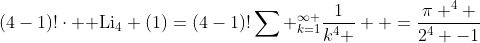 Jay wrote: .... the 4th power polylogarithm of 1 is precisely equal to : ..... Li4(1) = pi^4/90 ......